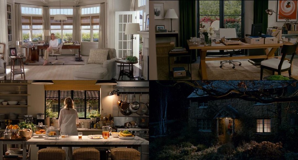 这种相似的氛围一部分来源于南希在电影中呈现的房屋内景所捕捉到的理想生活。 “房屋”是南希电影的一个母题。角色要么是换房子住,要么是住进别人的房子,又或是改建房子。与现实世界一样,这些房屋是角色的外延,体现着角色对自己生活的构想,像“爱很复杂”里简在孩子搬出后要扩大厨房一般。然而我们会发现,南希的房屋几乎都是一个样貌。以至于如果我们谷歌南希迈耶斯的名字,就会出现很多装修文章的条目,教人怎么将自己的房子装修成南希迈耶斯电影中的样子。她的名字已经成为一种风格,一种精致,优雅,安适,实用,丰沛的美式中产风。所以我们不妨说,南希电影中所呈现的房屋样貌,更多是她的外延,体现着她对于成功女性的想象,角色像是后来被放置其中的(我们鲜少能看到角色与环境的互动)。而当南希用大量的室内戏展示着这些象征着角色生活的景观时,这些她镜头中成功女性优渥的家庭内景已然将不少观众理想的生活图景具象化了出来。而这图景总是那么完美、优渥、小资,像是购楼中心总会带人进入的样板房和静止在节日拼图上的图画。